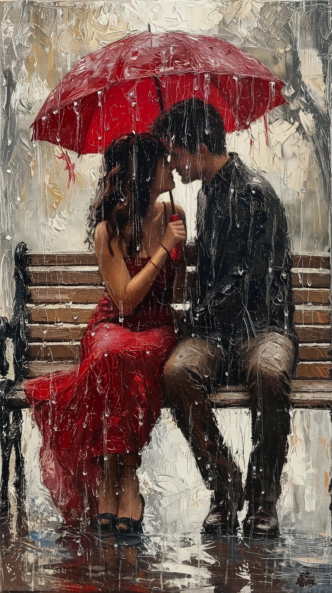 "A red umbrella, a wooden bench, and a storm that finally feels like home."